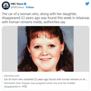 In an amazing find, the body parts of a woman who went missing 23 years ago with her daughter have been found in her car in Arkansas….