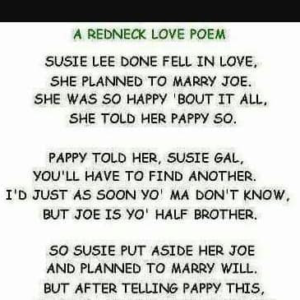 A REDNECK LOVE POEM SUSIE LEE DONE FELL IN LOVE, SHE PLANNED TO MARRY JOE. SHE WAS SO HAPPY ‘BOUT IT ALL, SHE TOLD HER PAPPY SO.PAPPY…