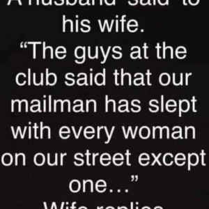 A husband said to his wife. “The guys at the club said that our mailman has slept with every woman on our street except one…” Wife replies…