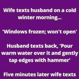 Wife texts husband on a cold winter morning…“Windows frozen; won’t open.” Husband texts back,“Pour warm water over it and gently tap edges with hammer.” Five minutes later…