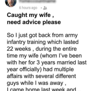 I just finished 22 weeks of army training. While I was away, my wife, who I’ve been married to for a year, cheated on me with several…
