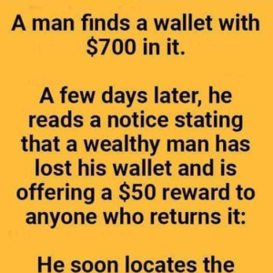 A man walking along the street found a wallet with $700 inside but no identification. Unsure whether to keep it, he later saw a notice from a…