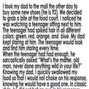 A 92-year-old man had a hilarious and unexpected reaction when he spotted a teenager with wild hair at the mall food court. While having lunch with his…