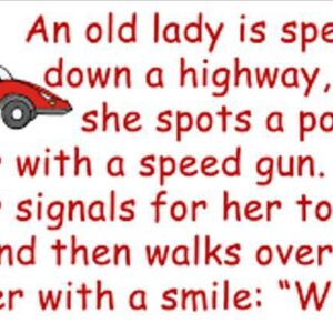 An old lady is speeding down a highway, when she spots a police officer with a speed gun. The officer motions for her to pull over, then…