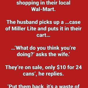 What do you think you’re doing? A husband and wife are shopping in their local Wal-Mart. The husband picks up a …case of Miller Lite and puts…