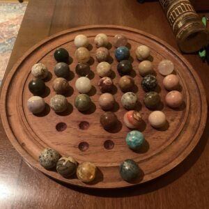 1ft-diameter wooden disk with 37 moveable marbles (1 inch diameter). 37 divots in the center, and a ring on the rim. Peg Solitaire: A Classic Brain Teaser…