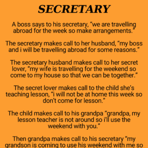 A boss says to his secretary A boss says to his secretary, “we are travelling abroad for the week so make arrangements.” The secretary husband makes call…