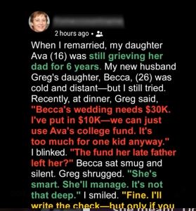 When my husband Greg casually suggested we use my daughter Ava’s college fund—left by her late father—for his daughter Becca’s wedding, I was shocked. That money…