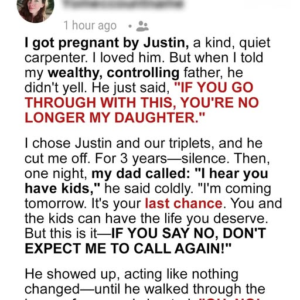 When I told my dad I was pregnant by Justin—a quiet carpenter—he disowned me. For three years, silence. No calls. No visits. Then he reappeared, suitcase in…