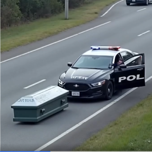 A routine patrol on a quiet rural highway turned strange when a police officer spotted a long, wooden object by the roadside. Slowing to investigate, he realized…