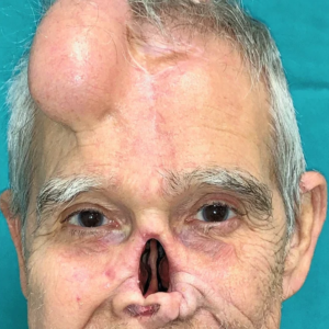 A 73-year-old man with recurrent squamous cell carcinoma spreading to the nasal septum, dorsum, and lymph nodes (cT4aN2bM0) previously underwent partial rhinectomy and left forehead flap repair…